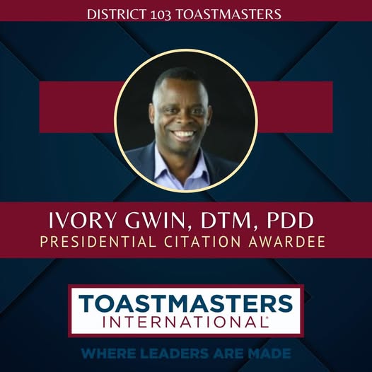 Past District Director Ivory Gwin, DTM, was awarded the Presidential Citation Award for Toastmasters year 2022-23. He is the first in District 103 to receive this prestigious honor. Recipients are announced each year at Toastmasters International Convention; Ivory’s award was announced in August 2023 at the convention. The Presidential Citation Award is presented to members who have shown continual support and dedication to the organization. Recipients of this citation are selected at the discretion of the International President.