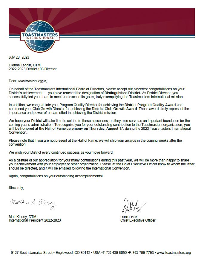 For the first time, D103 achieved Distinguished status! Congratulations to the 2022-23 District 103 leaders and members who made this happen.