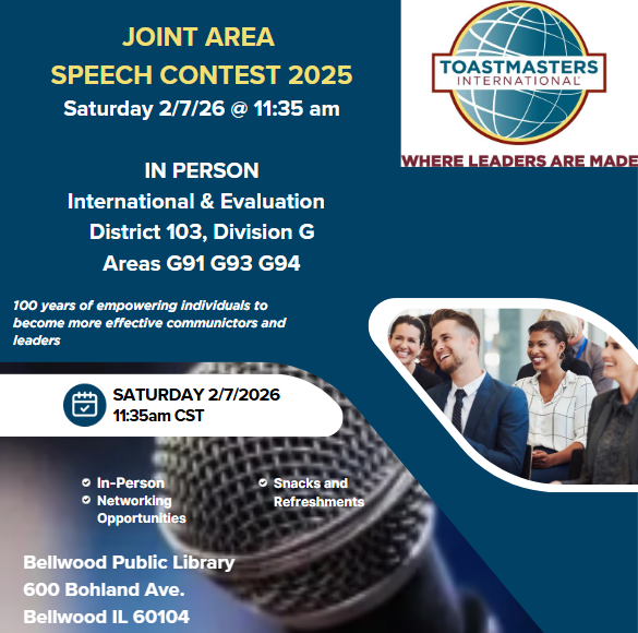Join us for an exciting Joint Area G Speech Contest featuring powerful speeches and insightful evaluations as contestants compete for a chance to advance to the Division G Contest in March.