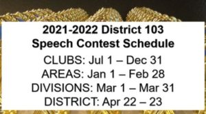 All division contest winners will advance to the District 103 Table Topics and International Speech Contests which will be held at the Annual Conference on Friday, April 22 and Saturday, April 23, 2022.